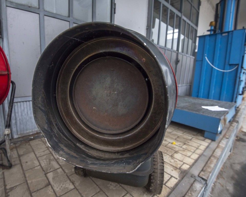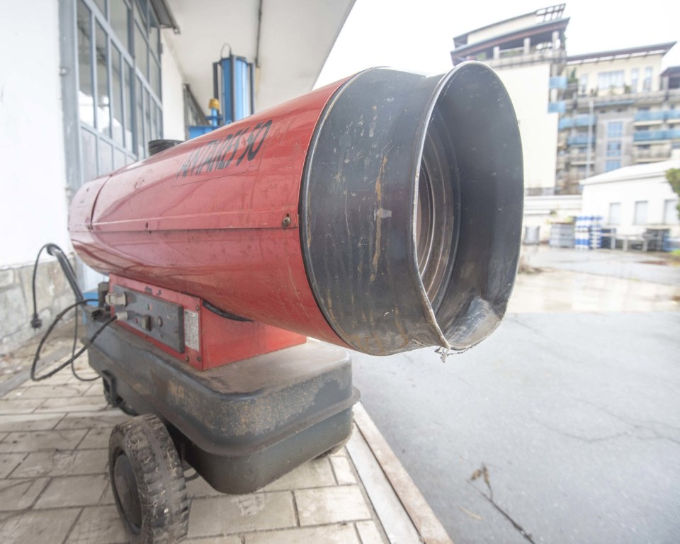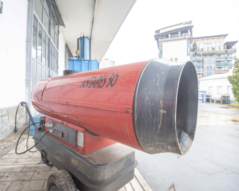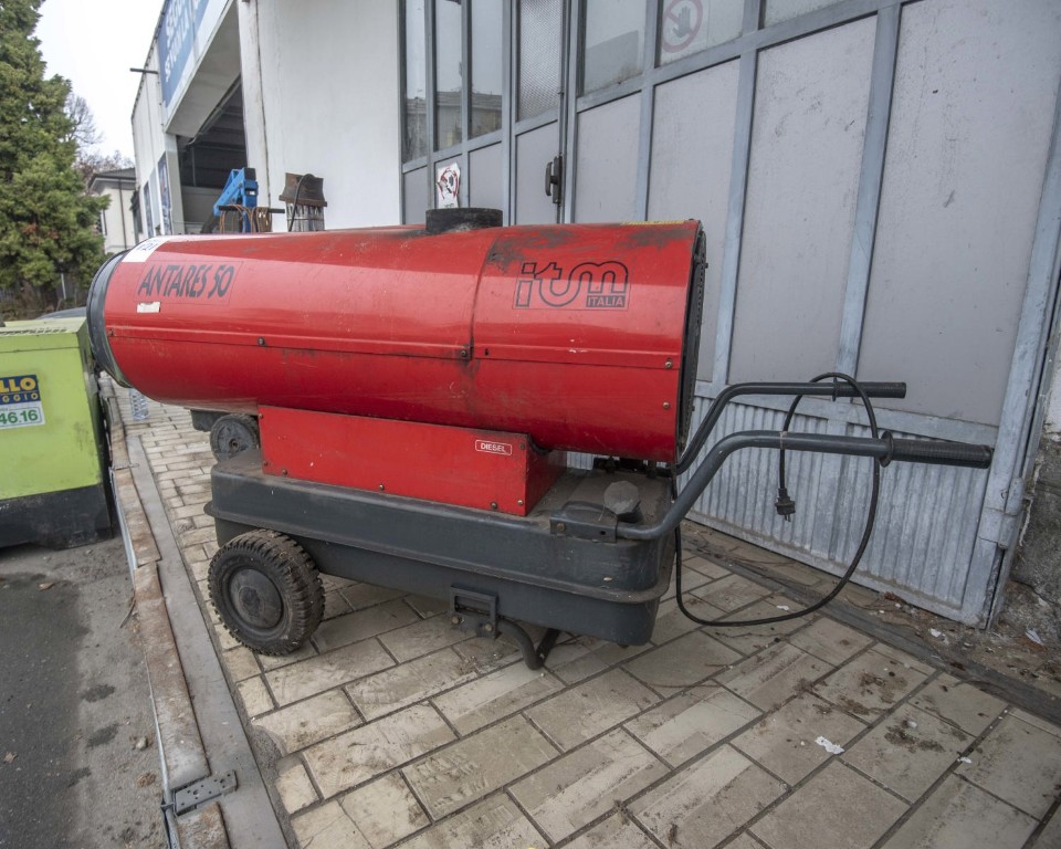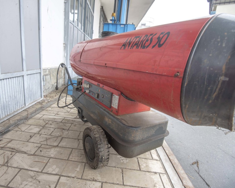 Mobile indirect-fired hot air generator with heat exchanger, designed for temporary space heating in workshops, warehouses and industrial areas. Nameplate data: 48 kW (41,280 kcal/h) burner output, airflow 1,900 m³/h, diesel fuel consumption 4 kg/h