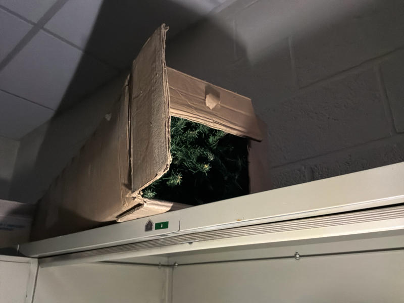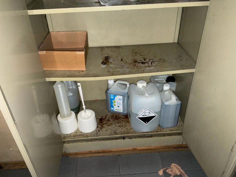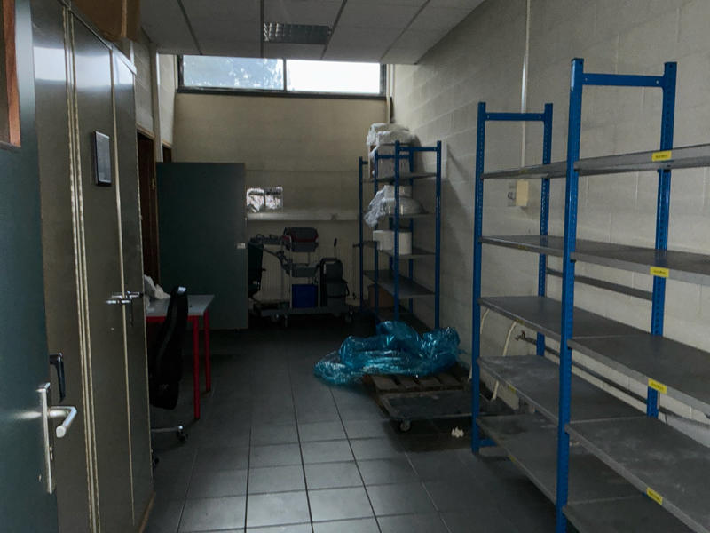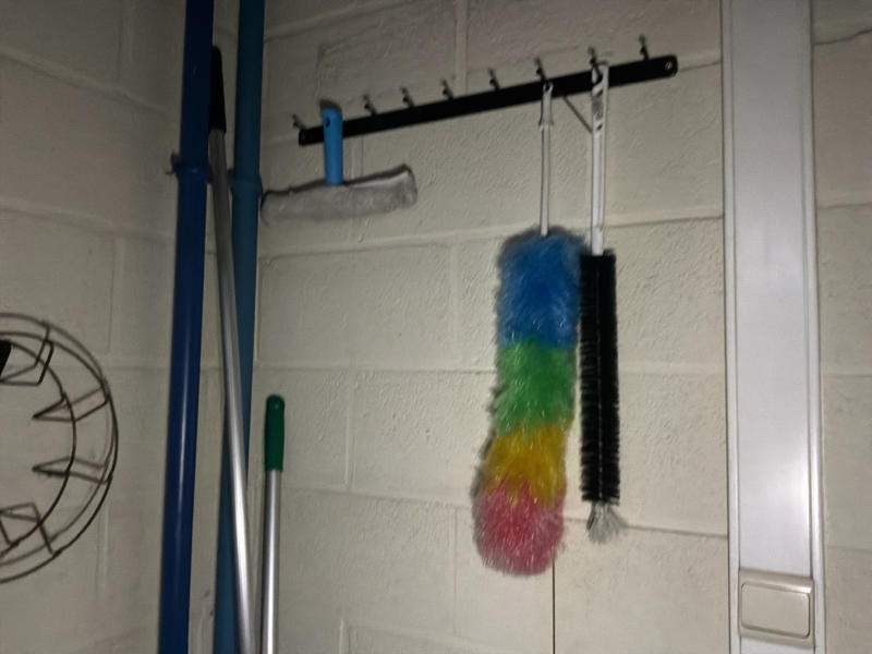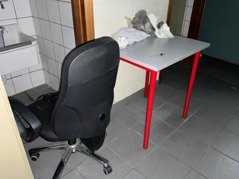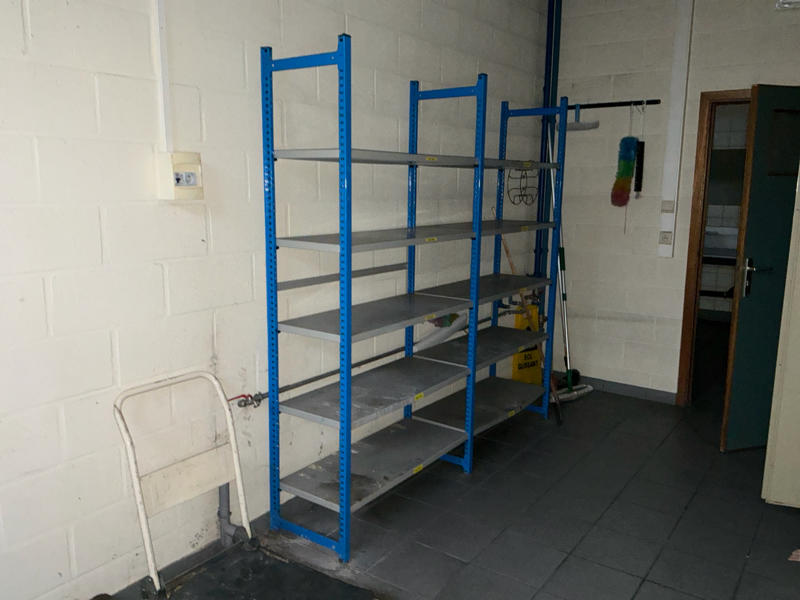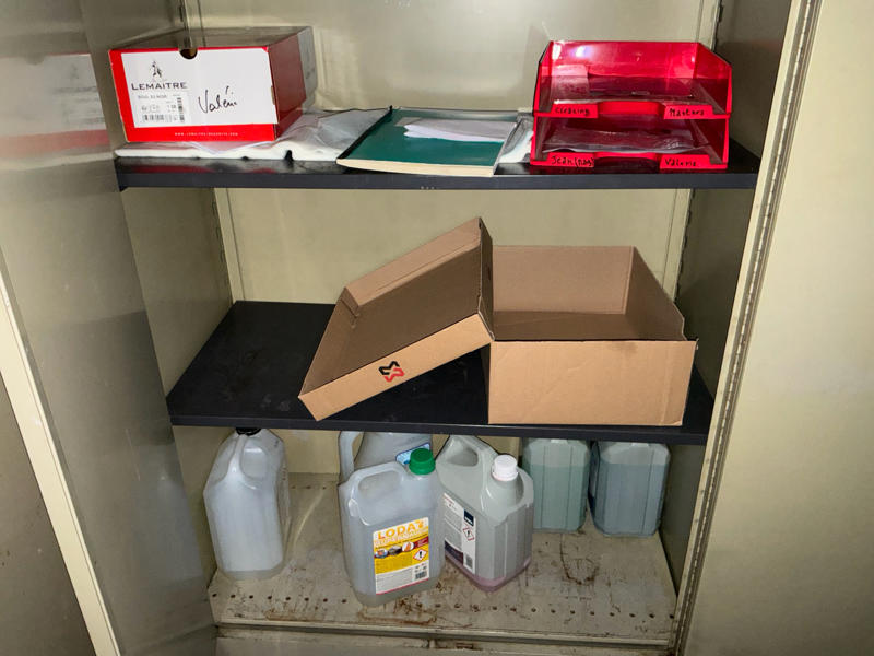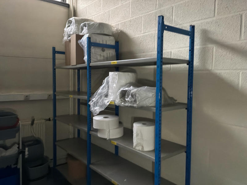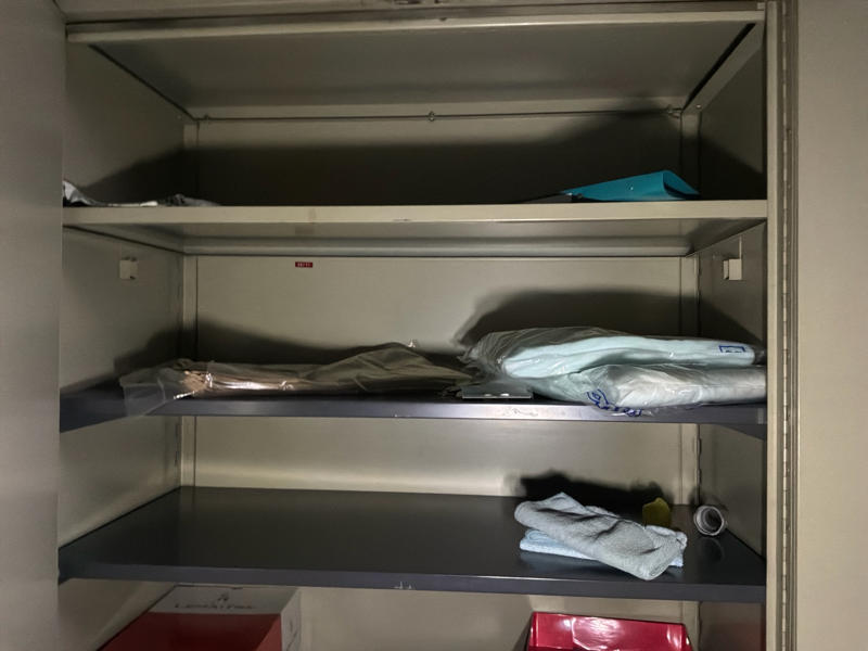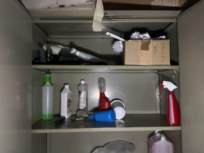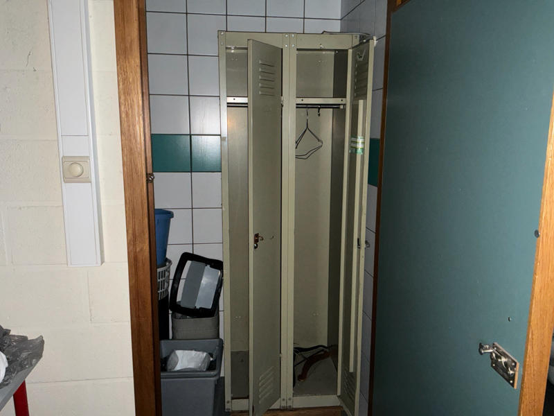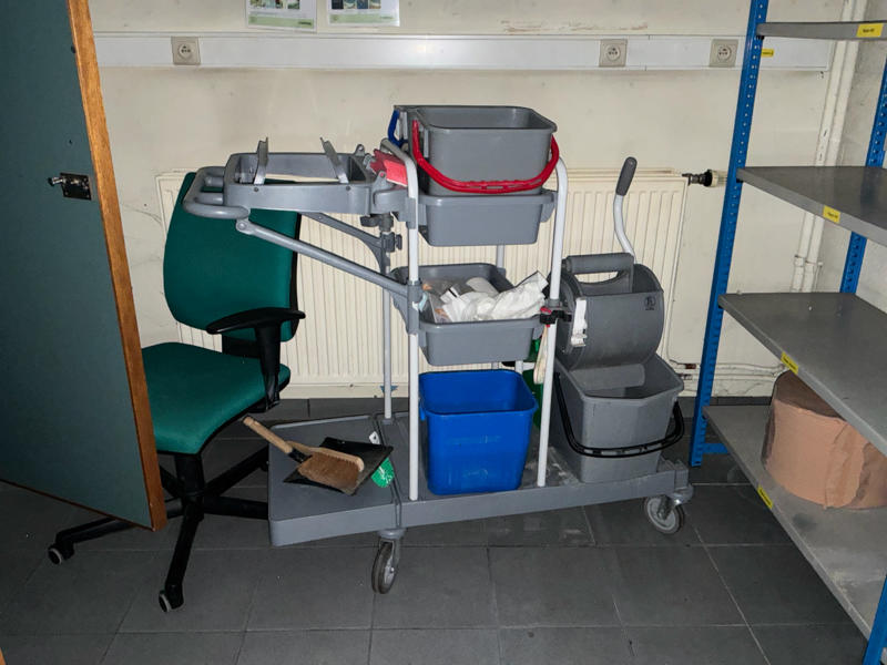 Comprend : chariot de nettoyage, 2 étagères, 2 armoires de rangement en métal, petite table, armoire à casiers