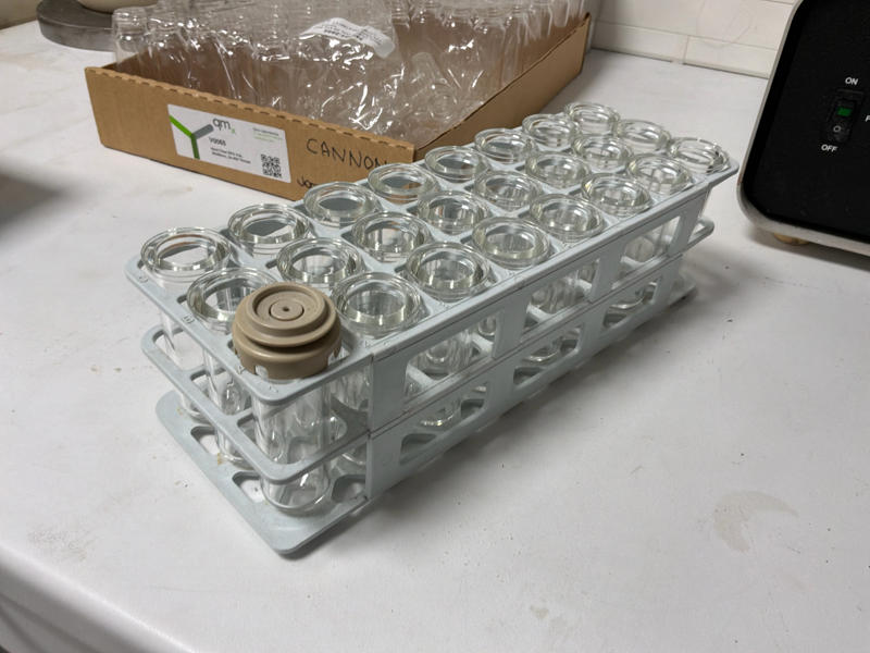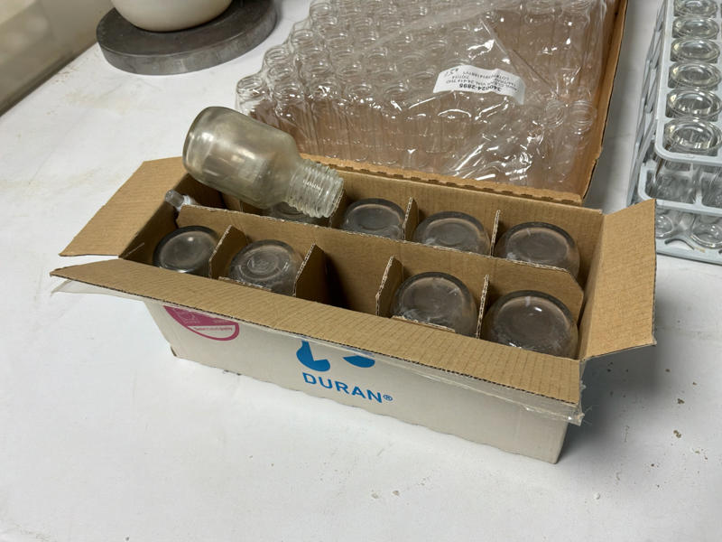 Inclusief: rekje met 24 glazen laboratoriumflesjes