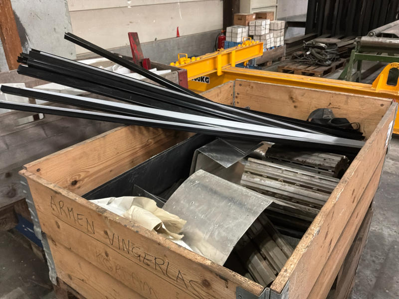 Sur 4 palettes avec colliers de palettes, conteneur à roulettes en bois et 2 plaques de protection pliées.