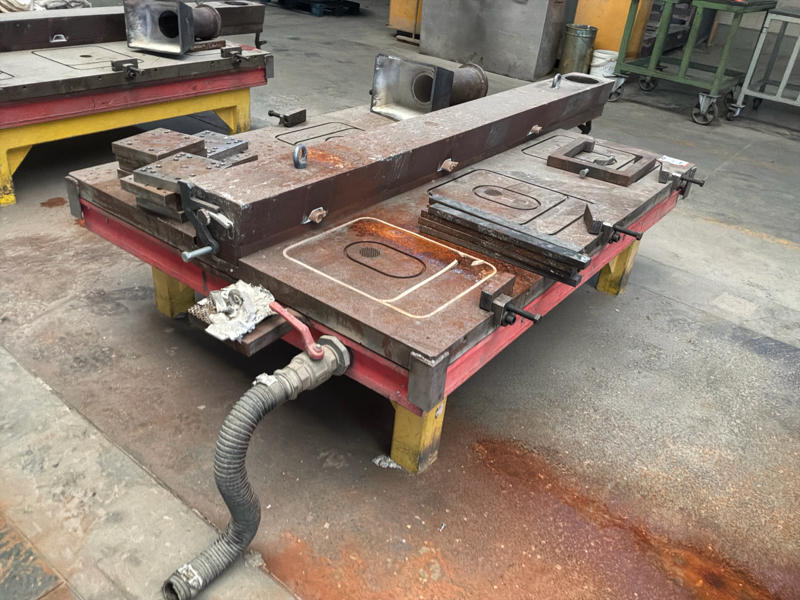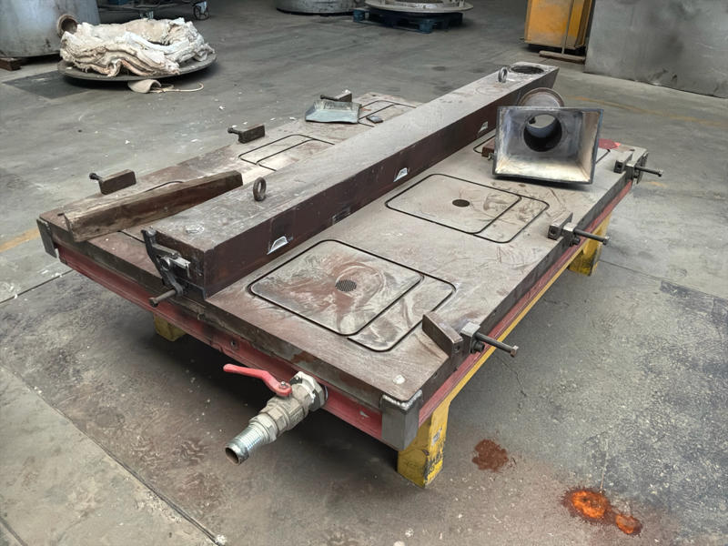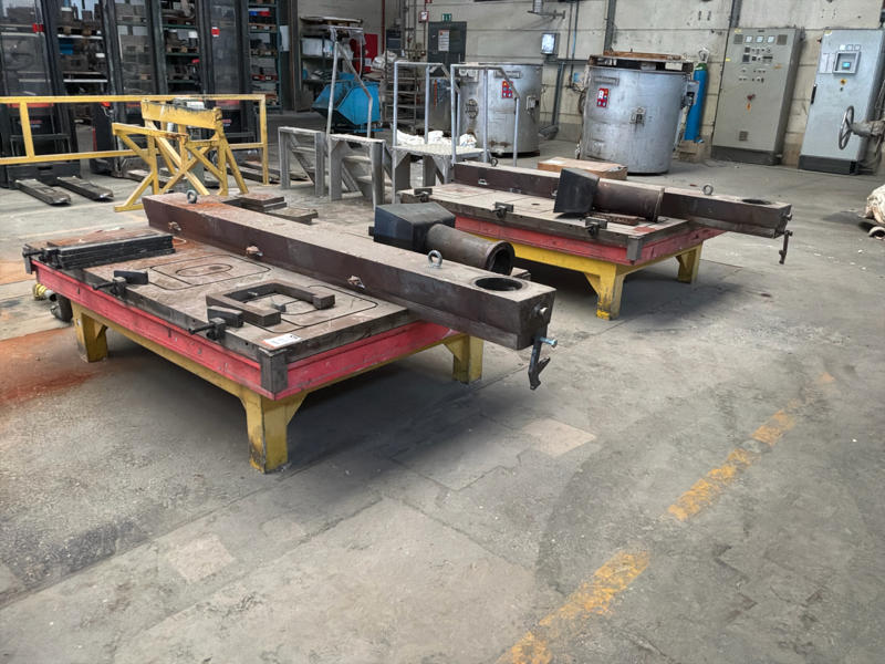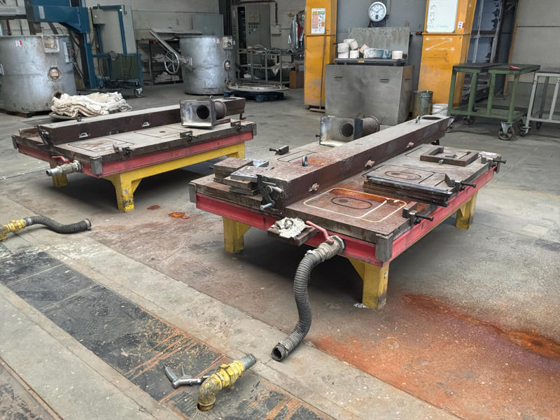 Zijnde metalen onderstel met gekoelde/verwarmbare tafel met klemmen voor gietvormen en vultrechter