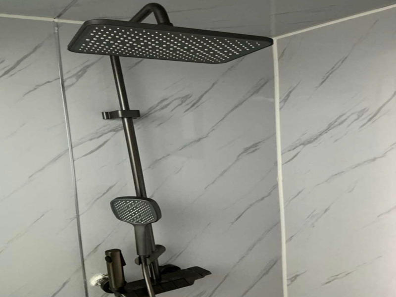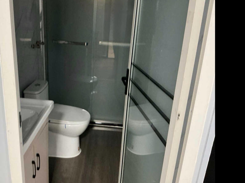 Badkamer met toilet, regendouche, wastafel met spiegel en toiletgarnituur; SPC-vloer in houtlook; stopcontacten (230 Volt aansluiting);