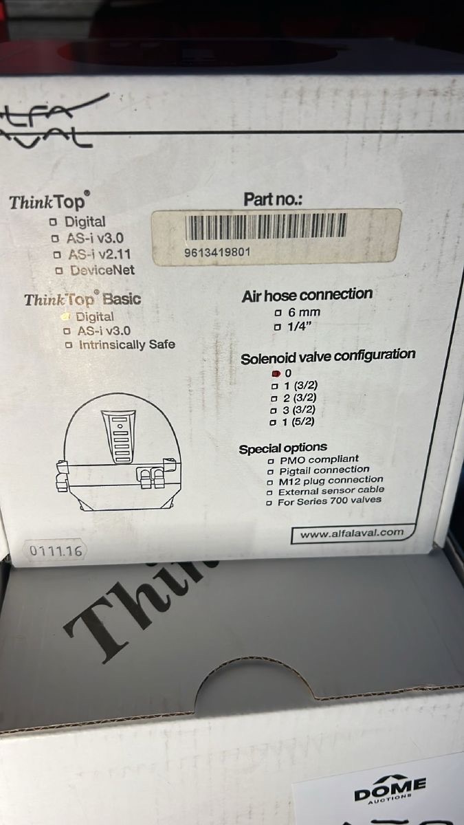 Valve sensing and control head for Alfa Laval sanitary pneumatic valves, designed to provide reliable valve position feedback and visual status indication for PLC-based automation. Configuration per label: Digital version with 0 integrated solenoid valves; air hose connection options listed 6 mm / 1/4”; compatible with Alfa Laval Series 700 valves (as indicated). Watertight, industrial design for hygienic process applications.